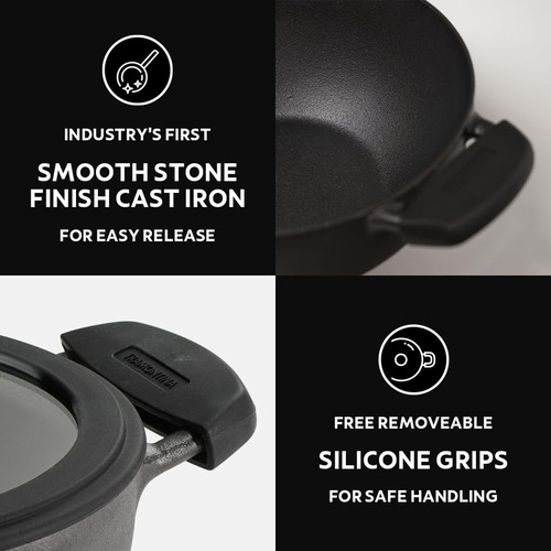 Tramontina TITANEX features superior quality pre-seasoned cast iron construction. This traditional cooking material provides exceptional heat retention and cooking performance, delivering perfect results for both everyday meals and special occasions. Features a high-quality toughened glass lid with silicone rings and steam release vents, allowing you to monitor your cooking while retaining moisture and flavors perfect for curries, veggies, and deep-frying. Unlike chemical non-stick coatings, this cast iron kadai consumes less oil. The natural cooking surface is ideal for health-conscious families seeking chemical-free cookware options. Equipped with innovative snap-on silicone grip handles for comfortable, secure handling. These removable grips offer superior heat protection for a safer cooking experience. Not dishwasher safe. Avoid soaking and dry thoroughly after washing to maintain seasoning and prevent rust. Ideal for stir-frying, deep-frying, and preparing flavorful Indian curries. The spacious 3.7L capacity makes it perfect for both everyday cooking and special meals.