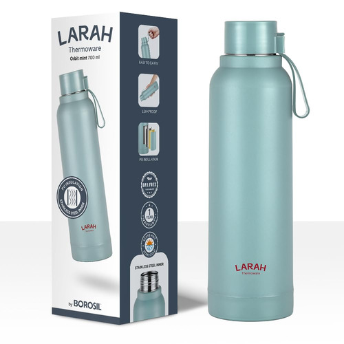 Stay hydrated in style with this Larah Orbit Round PU Thermoware Bottle, 700 ml, Mint, crafted for everyday convenience and lasting performance. The inner layer is made of N1 Grade stainless steel, ensuring rust-free and hygienic use, while the outer body is constructed from durable PP (polypropylene) material. The PU insulation maintains the temperature of your drink for longer hours, making it ideal for carrying water, juice, or other beverages to school, office, gym, or on the go. Lightweight and easy to carry, this bottle combines utility with a sleek thermoware design built to endure.