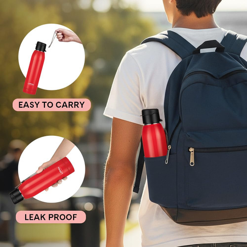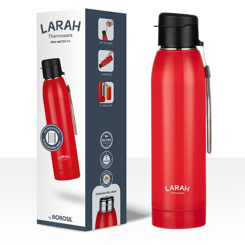 Stay hydrated in style with this Larah Airo Round PU Thermoware Bottle, 650 ml, Red, crafted for everyday convenience and lasting performance. The inner layer is made of N1 Grade stainless steel, ensuring rust-free and hygienic use, while the outer body is constructed from durable PP (polypropylene) material. The PU insulation maintains the temperature of your drink for longer hours, making it ideal for carrying water, juice, or other beverages to school, office, gym, or on the go. Lightweight and easy to carry, this bottle combines utility with a sleek thermoware design built to endure.