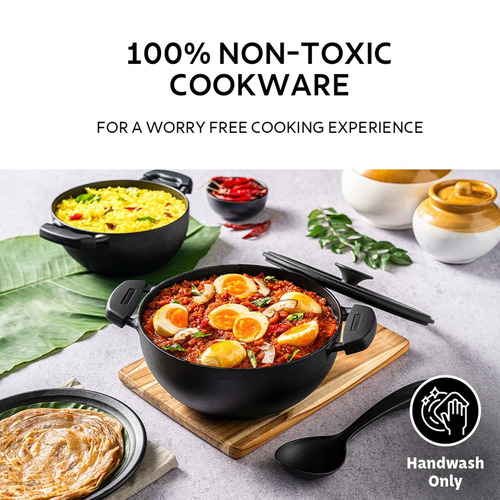Tramontina TITANEX features superior quality pre-seasoned cast iron construction. This traditional cooking material provides exceptional heat retention and cooking performance, delivering perfect results for both everyday meals and special occasions. Features a high-quality toughened glass lid with silicone rings and steam release vents, allowing you to monitor your cooking while retaining moisture and flavors perfect for curries, veggies, and deep-frying. Unlike chemical non-stick coatings, this cast iron kadai consumes less oil. The natural cooking surface is ideal for health-conscious families seeking chemical-free cookware options. Equipped with innovative snap-on silicone grip handles for comfortable, secure handling. These removable grips offer superior heat protection for a safer cooking experienc. Hand wash only. Not dishwasher safe. Avoid soaking and dry thoroughly after washing to maintain seasoning and prevent rust. Ideal for stir-frying, deep-frying, and preparing flavorful Indian curries. The spacious 4.6L capacity makes it perfect for both everyday cooking and special meals.